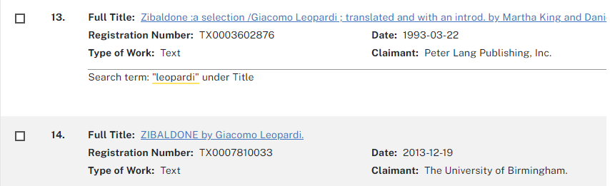 Nella stessa selezione,è presente anche il TFD Giacomo Leopardi e nel dominio completo le presenze sono anche maggiori e per arrivarci è sufficente 1 solo Click,tra oltre 1200 pubblicazioni:)